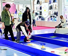 观众在“进博体育公园”体验掷冰壶。本报记者 蔺紫鸥摄/光明图片
