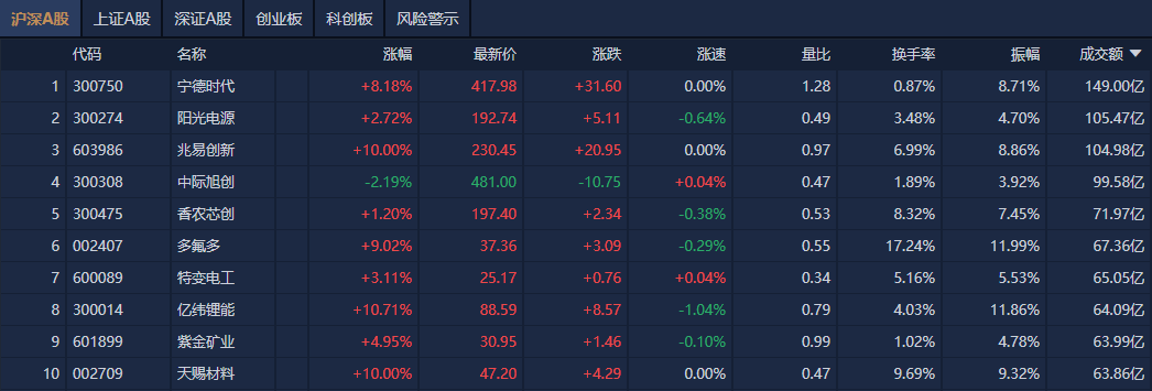 个股方面,宁德时代成交额超149亿元居首,阳光电源、兆易创新、中际旭创成交额靠前。